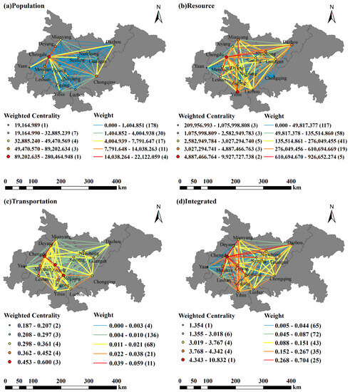 According to the comprehensive attributes of the population, resource, and transportation networks (Table 2), although all the networks have achieved full coverage of 240 links, the degree of clustering of each network is obviously different. Specifically, the MI in each network, ranked in descending order, is transportation > population > resource. Nonetheless, the integrated network does not exhibit pronounced agglomeration characteristics, implying heterogeneity in terms of the cohesive communities, participating members, and levels of involvement across the diverse networks. The network and weighted centrality are hierarchically classified according to the natural breaks methodology, and the results are shown in Figure 2.