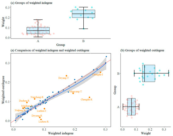 Comparison of weighted indegree and weighted outdegree. Notes: Using the natural break methodology, the weighted centrality is categorized into high-value (group B) and low-value (group A) groups. The red line is the balance line of weighted outdegree and weighted indegree, and the blue line is the fitting curve of the two degrees. The annotation of special points indicates the abbreviation of the city and the type of element, where R, T, and I, respectively, represent resources, transportation, and integration.