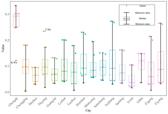 Weighted centrality box diagram of different network cities. Notes: The special points are labeled with the type of element and the type of weighted centrality. Weighted centrality is composed of two types of indices: Wi for weighted indegree and Wo for weighted outdegree.