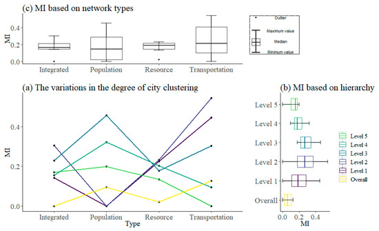 The variations in the degree of city clustering among different types of hierarchical networks. (b,c) represent the concentration trends of different network MI and different hierarchical MI, respectively.