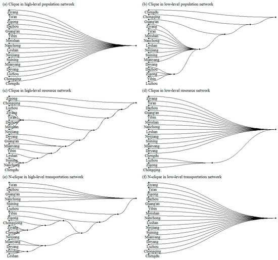 Several small, tightly connected, and synergistic groups are often generated in the network structure of urban agglomerations [48]. When cohesive subgroups are in the network, the actors within the community are closely connected and interact frequently in terms of resource flow and information exchange [49]. In SNA, cohesive subgroup analysis is widely adopted for subsets of networks with relatively strong, tight, frequently, or actively connected nodes [50]. The model empowers us to detect potential subcommunities or subgroups in the network. A cohesive subgroup is accomplished by UCINET software in the network of the University of California, Irvine [51]. To focus on observing the reciprocity of population and resource networks at high and low levels and the accessibility of the transportation system, the connection is divided into high and low levels by combining the natural breaks methodology in ArcGIS, and then binarization and standardization are carried out to conduct clique and N-clique, respectively.