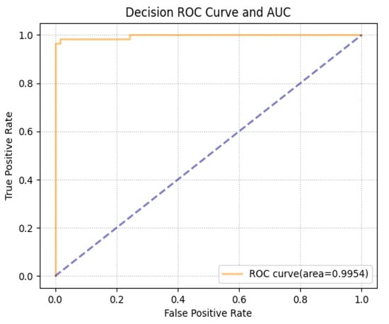 Accuracy measures the proportion of correct classifications, precision refers to the proportion of correctly predicted positive samples in the detection framework, recall is the probability of actual positive samples being predicted as positive for the original samples, and the F1-score considers both accuracy and recall, finding a trade-off between the two. The ROC-AUC curve is formed by the True Positive Rate (TPR) and the False Positive Rate (FPR), while the AUC indicates the size of the area under the ROC curve. The higher the AUC, the more likely it is that the current classification algorithm will produce more positive samples than negative ones, resulting in better classification results. The ROC-AUC curve can effectively eliminate the influence of sample category imbalances on the index results. The above metrics are expressed as follows: