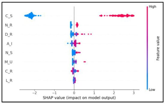 The SHAP summary plot shows the distribution of each feature and the degree to which each feature affects the model output. Figure 4 shows a scatter diagram of the SHAP values of each sample feature, where the x-axis refers to the feature influence weight and the y-axis is arranged in descending order of the feature importance. The wider the distribution area, the greater the influence of the feature on the classification result. The region distribution of consistency of semantic (C_S) in the figure is the widest; that is, it has the most significant influence on main stream and tributary classification. Each point represents a sample feature, and different colors indicate the effect of the size of the feature value on the results (red for high, blue for low, and purple for close to the mean). For example, from the color distribution of the points of the semantic consistency feature, it was found that the smaller the feature value, the smaller the SHAP value, and the larger the feature value, the larger the SHAP value. Therefore, the value of the feature is positively correlated with the SHAP value.