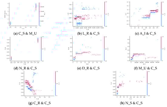 - In Figure 6e, the larger the depth of reaches, the larger the feature value. When the depth exceeds five, it contributes positively to the model’s predicted value. When the consistency of the semantic feature value is 1, it has a greater impact on classification.