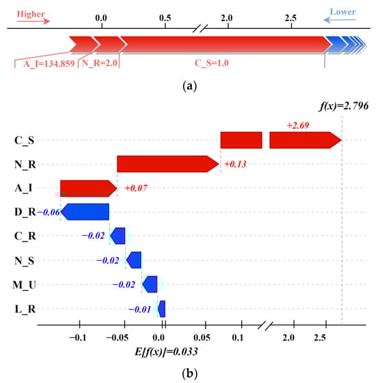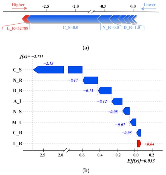 The main stream with ID = 346 and tributary with ID = 275 were selected separately to explain the CatBoost classification model from the perspective of a single sample. Force and water plots were calculated and visualized for the main stream and tributary samples. In the force plot, each feature value is a force that increases or decreases the prediction, and each attribute value is an arrow that indicates an increase or decrease in the prediction, with red and blue arrows representing a positive and negative contribution, respectively; the higher the length, the more significant the contribution. In the water plot, the horizontal axis indicates the SHAP value, and the vertical axis indicates the value of each sample feature. Blue indicates that the feature harms the prediction, and an arrow pointing to the left indicates a decrease in the SHAP value. Red indicates that the feature positively affects the prediction, and an arrow pointing to the right indicates an increase in the SHAP value, where E[f(x)] denotes the SHAP base value, which is the mean value predicted by the model.