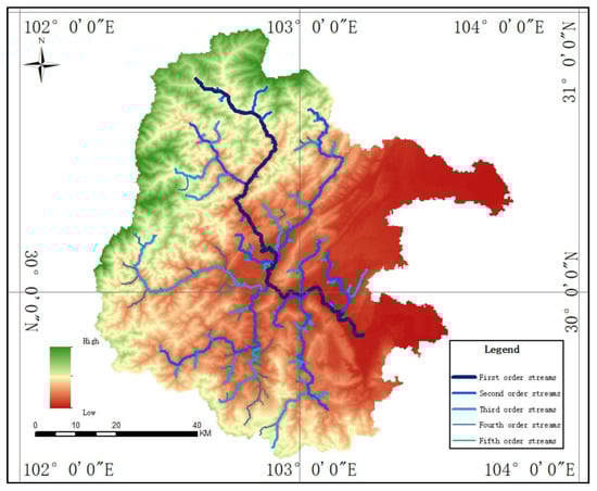 The river network was graded according to the above classification results (Figure 9). The classification in this study considered the semantic, geometric, and topological features of river networks, making the identification of the mainstreams and tributaries of river networks more effective, and the main stream features are noticeable after classification. It can be observed from the graded rivers that the river network has a rational hierarchical structure. The main stream and tributary relationships are apparent between all levels of rivers, and the parent–child and left-right branch relationships are clear, which is more consistent with manual identification results and satisfies the mapping requirements.