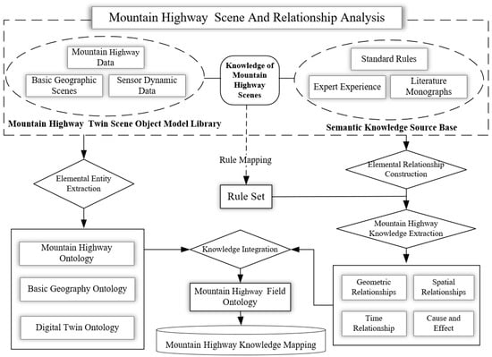 This article adopts a top-down method to construct the knowledge graph. Constructing knowledge graphs using a top-down approach facilitates a comprehensive understanding of the situation to avoid over-construction and information redundancy [47,48,49,50]. First, the diversified objects of mountain highway scene and their associated relationships are analysed, based on the data of mountain highway [51,52,53], basic geographic scene, highway sensor dynamic data and domain-related textual data. Second, according to the content of entities and relationships, the domain ontologies of mountain highways, geographic scenes and the Internet of Things are constructed. Finally, this article establishes a rule set to connect entities from multiple domains to achieve rule-based knowledge fusion across multiple domains. At the same time, the domain ontology of the digital twin scenario for mountain highways is constructed, and the knowledge graph for digital twin scenarios of mountain highways through ontology mapping is established. The knowledge graph construction method is shown in Figure 2.