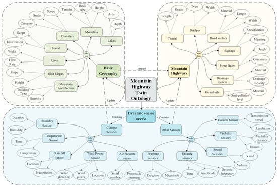 In order to build an ontology of mountain highway scenes and a twin knowledge graph of mountain road scenes for better management of mountain road data, a top-down approach is adopted. This approach analyses domain knowledge from literature, standards, rules and experts to clarify the relationships among entities and attributes [54,55,56]. Based on the knowledge set of mountain highway mapping and sensor data, the relationship extraction is performed. In this step, in order to analyse the susceptibility of accidents on mountain highways and achieve bidirectional feedback of twin data, the focus is on analysing the association relationships between entities in dynamic data scenarios and the various impacts of the represented content on mountain highway scenarios.