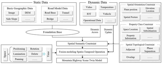 To achieve the fusion modeling of mountain highways, a real-time fusion modeling method is proposed for mountainous scenes and highway models under spatial semantic constraints. The overall framework for the fusion construction of twin scenes on mountainous highways is shown in Figure 4. First, the access of static and dynamic data provides a basic foundation for the twin scene. Second, semantic constraint rules are constructed on spatial orientation, attribute categories and spatial topology constraints to guide the construction of the entire twin scene. Finally, according to the semantic constraint rules, various scene models are combined, matched and adjusted to achieve the dynamic construction of the digital twin scenario for mountainous highways.