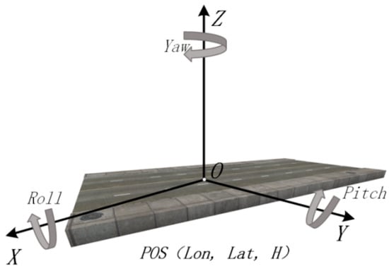 The spatial orientation constraint adopts the spatial coordinate information and three-dimensional attitude information (pitch angle, yaw angle and roll angle) of different physical objects in the highway model. Then, the matching of the spatial position registration and spatial pose between different entity objects can be achieved under a unified geographic reference coordinate system. The yaw angle, pitch angle and roll angle in spatial posture represent rotation around the Z-axis (vertical axis), Y-axis (latitude direction) and X-axis (longitude direction), respectively. The spatial position and spatial attitude are shown in Figure 5.