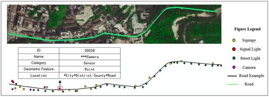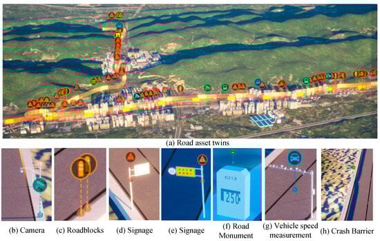 In order to better manage the roads in the target area, a scene fusion model is used as the basic foundation, and dynamic data from various sensors are integrated into the scene to update the entity information in the knowledge graph. The updated information is then fed back in real-time to the digital twin system of mountain highways, achieving real-time updates and expression of road asset data. Some expressions of road assets are shown in Figure 15.