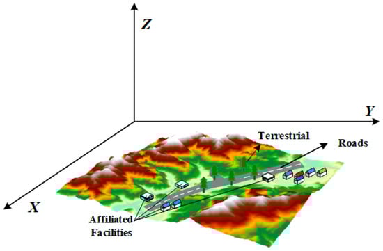 In the formula, represents the three-dimensional coordinates of corresponding road, sensor symbol and other object data when the 3D terrain tile is at level i. represents the 3D terrain model. Level represents the corresponding tile level. represents the two-dimensional coordinates of geographical objects. The details are described in Equations (3)–(6):