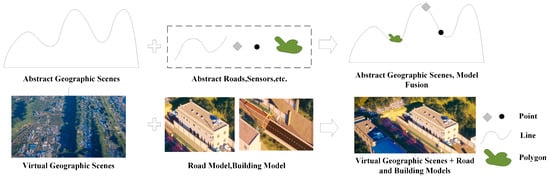 Constructing realistic mountain highway scenes is the key to achieving information-based operation and maintenance management of mountain highways, which helps to improve the efficiency of information perception, precise positioning and management analysis; therefore, achieving the seamless fusion of terrain models and highway models is particularly important [25,26,27,28,29,30,31,32]. Many studies currently focus on the fusion of terrain and features models. The Z-buffer algorithm and floating horizon method [33,34,35,36] and the fusion expression of terrain and terrain model is achieved by the geometric embedding method [37,38,39], obtaining the fusion area triangulation network by using the feature constraint line and the collision detection method between the terrain triangulation network. The fusion of the terrain model and the terrain is achieved by using the local reconstruction of the terrain grid [40,41,42]. The fusion display of terrain and ground objects is achieved through the construction of a multi-level regular triangulation network, incorporation of a transition area, and implementation of dynamic scheduling for view LOD (Level of Detail) [43,44,45,46]. Most of the fusion methods presented above predominantly use feature line constraint fusion for single-scale scenes. These approaches often lead to grid cracks at the junction of feature boundaries and terrain, which fails to achieve the dynamic visualisation demands of multi-level and multi-scale terrain scenes. Although the multi-level regular triangular network fusion partially resolves the cracks in the fusion process, it requires a significant amount of memory and computational resources. Furthermore, most previous research relies on spatial semantic information as a constraint, resulting in an incomplete semantic understanding of the scene and knowledge graph constraints. As a result, it is difficult to apply these approaches to fusion expression for mountainous highways with complex features and correlated information.