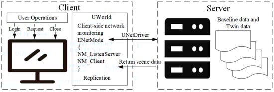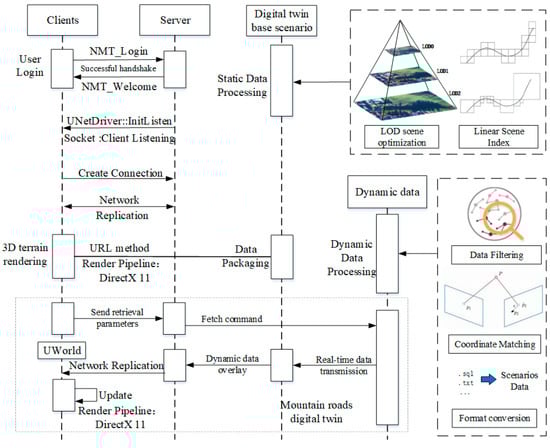 The visualisation of the digital twin base scene is shown in Figure 10. First, the LOD and linear index of the mountain highway model are constructed to support efficient scene drawing. Second, when users perform mountain highway twin interaction operations on the client interface, the main thread is controlled to start or stop requests and transmissions. This meets the interactive needs of users in the digital twin scene of mountain highways. Finally, when the user clicks to enter the client, the system initialises as a whole. The user performs a handshake login between the client and server while logging in. At this point, the main thread is responsible for sending messages to the client UWorld. UNetDriver is responsible for listening to messages from the main thread and communicating with the server, asynchronously requesting twin data and receiving data returned by the server for visual rendering.