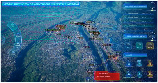 Mountain highways are key nodes and hubs projects that connect urban areas with mountainous regions, and realise the interconnection of transportation facilities. They serve as an important channel for expanding human living space, and greatly promote economic development and ensure the safety of social life [1,2,3,4,5]. However, the terrain and landforms in mountainous regions are complex and diverse. Therefore, it is very important to combine modern technology with mountainous highway operation, maintenance and management technology, and create an increasingly intelligent mountain highway management system to improve the level of information management and work efficiency of mountain highways. Digital twin technology is an effective way to achieve the information management of mountain roads [6,7,8,9,10]. Digital twin technology is the mapping of the properties, structure, state, performance and behaviour of real physical entities to the virtual world [11,12,13,14,15,16,17,18]. Digital twin technology also seeks to create a realistic virtual scene of mountain highways with high fidelity and interconnection of all elements, realise the accurate representation of highway operation status and rapid response to road condition information, and better support the information management decision of mountain highways [19,20,21,22,23,24].