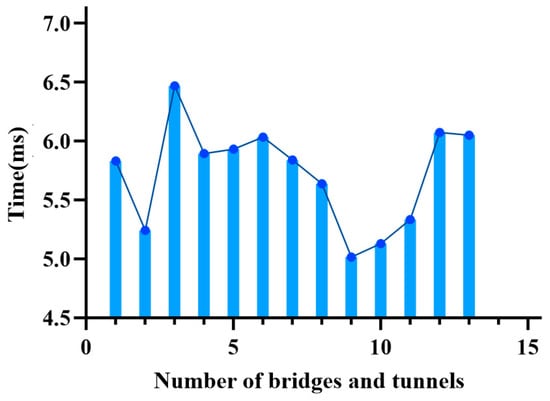 The efficiency of terrain grid calculation for the road-bridge-tunnel fusion area is key to improving the capability of scene fusion. To validate the efficiency of the proposed method in scene integration, an analysis of the efficiency of terrain grid calculation for the road-bridge-tunnel fusion area is shown in Figure 14, which shows the calculation time of different terrain grids at the tunnel and bridge piers. The case study area spans 100 km and includes 2 tunnel entrances and 11 bridges. From Figure 14, it can be seen that the average time for calculating terrain grids at each tunnel is 5.97 milliseconds, significantly improving the fusion display efficiency.