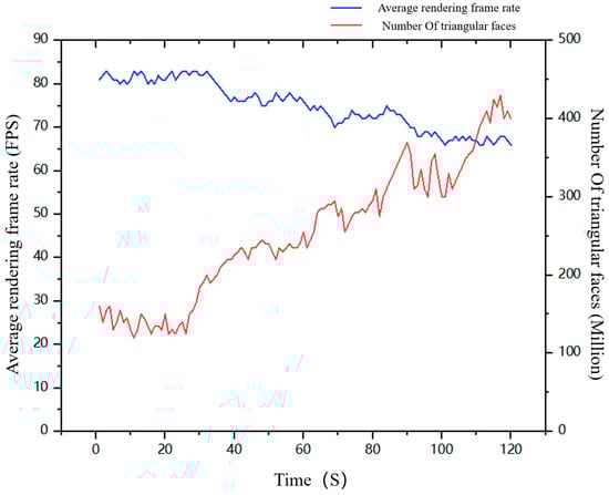 The efficiency of scene rendering is directly related to the user experience. If the rendering efficiency is too low, it can cause scene rendering lag, uneven loading and poor user experience. In this paper, a random period of system operation is selected, and the scene rendering efficiency and the number of triangular facets in the scene rendering are recorded to verify the scene rendering efficiency of the proposed method. The experimental results are shown in Figure 18.