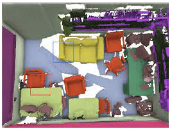 room usage classification method that infers the type of room usage based on the spatial configuration of room scenes, i.e., how the furniture objects in a room are placed in relation to each other and to structural elements such as walls, doors, and windows. An example of a room scene with furniture objects is shown in