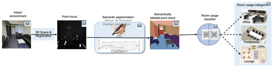 ). Next, the point sets of a room are semantically segmented either manually or automatically (see box
