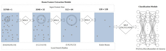 Our method has multiple design parameters that are currently optimized for classifying rooms in office buildings in the S3DIS data set. Thus, the choice of these parameter values may need to be reconsidered when applying this method to other types of buildings and room types. For example, our deep learning architecture has multiple search radii that determine the size of local regions for local feature extraction. The current search radii are (0.4 m, 0.6 m, 0,8 m, 1.0 m, 1.2 m,1.4 m, 1.6 m, 1.8 m, 2.0 m, 2.2 m); in practice, these should be adjusted according to room sizes, point densities, and types of furniture objects being considered.