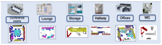 http://buildingparser.stanford.edu/, accessed on 20 January 2021), which contains point cloud representations and with semantic object labels for 272 rooms in six office building areas. Our trained classifier achieved 91.8% accuracy on the task of classifying rooms into six top-level categories for office buildings (conference room, lounge, storage, hallway, office, and bathroom). We further investigated the possibility of differentiating rooms in fine-grained subcategories of offices, conference rooms, and storage rooms. We found that, while