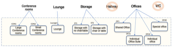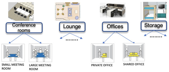 22]. They typically require highly engineered features and knowledge rules defined on the geometric and topological information of room categories. Although they can recognize general room categories defined during the design stage, they are not concerned with the usage and occupancy aspects of room semantics. They were designed to work for small-scale indoor structures, such as residential buildings, which have a small number of well-balanced room types.