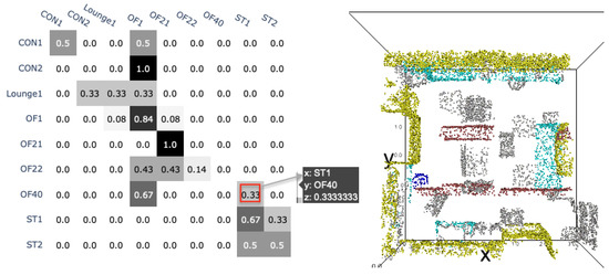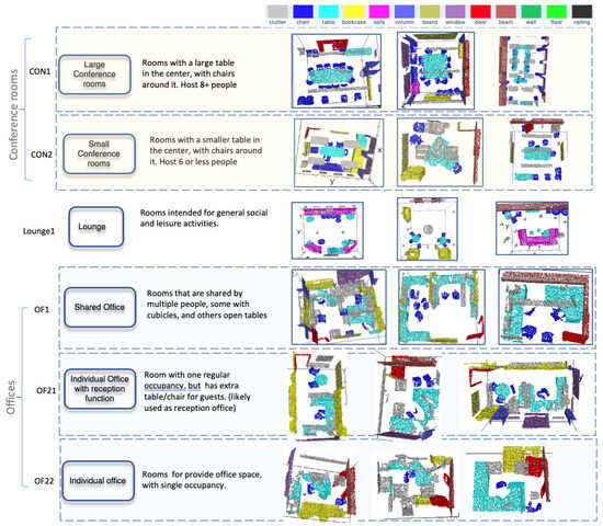 Figure 13, it can be seen that 33% of the lounge rooms were misclassified as CON2 and another 33% were misclassified as OF1. After checking the original point cloud data, we confirmed that these three subcategories of rooms are indeed very confusing even for humans. Lounge rooms tend to have chairs and tables placed more randomly in relation to each other and to walls, making it hard to learn the common features of their spatial layout.
