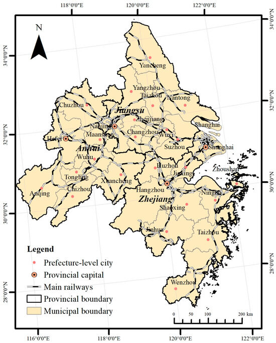 The Yangtze River Delta urban agglomeration, situated in the eastern coastal region of China, is one of the most active, open, and innovative regions in China. It is crucial to the Yangtze River Economic Belt and the Belt and Road Initiative’s construction. On the basis of the Yangtze River Delta Urban Agglomeration Development Plan (2016–2020) issued by the State Department of China, the study area covers 27 prefecture-level cities, including core areas of Jiangsu Province, Zhejiang Province, Anhui Province, and Shanghai Municipality, with a land area of 225,000 km2 (Figure 1). The seventh national census shows that the total resident population of the Yangtze River Delta urban agglomeration reached 235 million by the end of 2020, with a population density of 656 persons/km2, and this density is 4.5 times the national average. Research data were mainly from the 2011–2022 China Urban Statistical Yearbook, China Regional Economic Statistical Yearbook, and provincial and municipal statistical yearbooks. Traffic data (highways, national roads, provincial roads, county roads, township roads, and other roads) were derived from the Open Street Map website (http://www.openstreetmap.org/, accessed on 16 December 2022), and after topology checking, road network datasets with reasonable topological connectivity relationships were constructed.