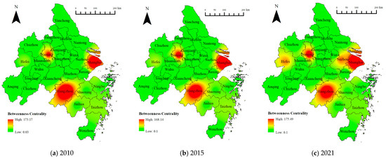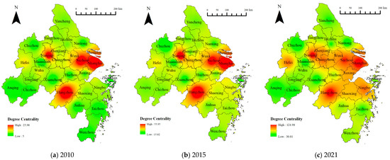 Pursuant to the result of innovation correlation among cities in 2010, 2015, and 2021, a three-year network dichotomous matrix was built. The degree centrality and betweenness centrality of each city in 2010, 2015, and 2021 were computed using Ucinet. According to the inverse distance weight method in ArcGIS, spatial interpolation analysis was conducted. Based on this, distribution maps of degree centrality (Figure 4) and betweenness centrality (Figure 5) from 2010 to 2021 were obtained.