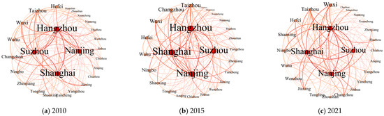 The Yangtze River Delta urban agglomeration’s innovation correlations from 2010 to 2021 were evaluated by utilizing the modified gravity model, and ArcGIS 10.2 was used for spatial visualization (Figure 3). The scope of the primary and secondary networks of innovation correlations had gradually expanded, with less change in the third, fourth, and fifth networks from 2010 to 2021. Specifically, the correlation strength of the innovation network varied significantly, and the correlation axes of high-level innovation correlations increased significantly from 2010 to 2021. In 2010, the strongest innovation correlations were between Shanghai, Hangzhou, and Wuxi City, forming two secondary innovation correlation axes of Shanghai–Hangzhou and Shanghai–Wuxi. In 2015, the number of secondary innovation correlation axes increased to six, and five new secondary innovation correlation axes were added, namely Suzhou–Jiaxing, Nanjing–Changzhou, Nanjing–Wuhu, and Nanjing–Maanshan. In 2021, both the level and number of innovation correlation axes were greatly increased; the innovation correlation axes of Shanghai–Jiaxing, Shanghai–Suzhou, and Suzhou–Wuxi were upgraded to primary, the number of secondary innovation correlation axes increased to seven, and the number of tertiary innovation correlation axes in the central region of the Yangtze River Delta urban agglomeration increased significantly. The innovation correlation axes of Shanghai–Hangzhou, Shanghai–Hangzhou, and Nanjing–Shanghai formed a triangle. Shanghai, Nanjing Hangzhou, and other economically developed coastal cities, had more subjects participating in innovation cooperation, and the innovation correlations among innovation subjects were relatively close, forming an innovation network that was conducive to the flow and spillover of local knowledge. Nanjing had a close connection with some cities in Anhui Province, and this was mainly caused by geographical proximity. In general, the Yangtze River Delta urban agglomeration basically formed a network structure with Shanghai, Hangzhou, Nanjing, and Suzhou as the core, radiating to the surrounding cities, and the network correlation was gradually increasing. In 2010, 2015, and 2022, the innovation network density was 0.257, 0.262, and 0.265, and the average cluster coefficient was 0.361, 0.383, and 0.391, respectively, indicating that the innovation cooperation and correlation between cities were continuously strengthened and clustered, and the phenomenon of a “local area network” appeared within the network.