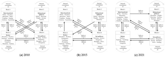 In general, from 2010 to 2021, based on the number of receiving relations and spillover relations, blocks 2 and 4 played the roles of “broker” and “net spillover”, respectively. In 2021, the receiving relation of block 1 was close to the spillover relation, and the relation of members within the block had relatively increased, so it changed from a “main beneficiary” block to a “two-way spillover” block. Moreover, the number of receiving relations of block 3 was higher than that of spillover relations, so it changed to a “main beneficiary” block.