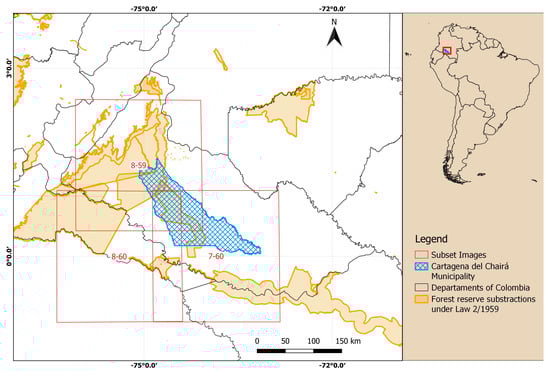 Colombia, with all its departments marked; the red square represents the location of Caquetá. Close-up of the location of Cartagena del Chairá (blue polygon) municipality, located inside the Caquetá department (gray polygon). The yellow polygons determine the forest reserves that can be subtracted and used for economic activities. The red squares are the subset of images utilized from Landsat to cover the entire region; the numbers inside the squares indicate the satellite path and row.
