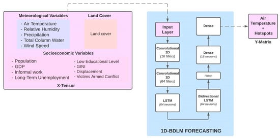 Meteorological variables are at an hourly resolution, unlike socio-economic data, which vary in temporal resolution. Within the model, meteorological variables change dynamically, while socio-economic variables remain static at an hourly level but adapt based on their specific temporal resolution. This approach aligns with the methodology by [13], where a variable remains constant until updated by new input data occurring monthly or annually, depending on the variable. Land cover data, available annually, remains static within the model, receiving yearly updates. Before integrating them into the model, all variables are adjusted to match the spatial resolution of ERA5 data, socio-economic variables remain spatially constant across the study area, and their temporal aspects shift according to their respective temporal resolutions. In summary, the X-tensor (input) contains meteorology—land cover variables, each maintaining its unique temporal and spatial resolution. This temporal flexibility offers a significant advantage, allowing variables to update independently based on their data sources without requiring simultaneous adjustments, as detailed in the described method. The Y-matrix (output) is created by the air temperature from the ERA5 data, including the brightness temperature from the hotspots of the MODIS dataset (Figure 2). In other words, we took the brightness temperature from the hotspot data and its position and replaced it with the same position of the ERA5 data to be sure that the output includes forest fires values for detection, meaning that, for the ML model analysis, the native resolution of the hotspots is changed to match the ERA5 grid.
