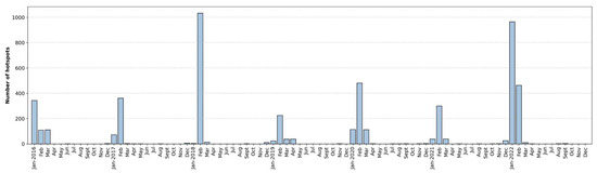 Hotspot data were gathered from the Fire Information for Resource Management System (FIRMS), utilizing measurements from both the Moderate Resolution Imaging Spectroradiometer (MODIS) with a spatial resolution of 1 km2 and the Visible Infrared Imaging Radiometer Suite (VIIRS) spanning from 1 January 2013 to 31 December 2022 [27] and with a spatial resolution of 375 m2. The identification of a wildfire event required a measurement reliability surpassing 80% and a brightness temperature exceeding 360 K, following the criteria established by [28]. Additionally, alternative thresholds of 370 K, 350 K, and 340 K were tested and yielded comparable outcomes.