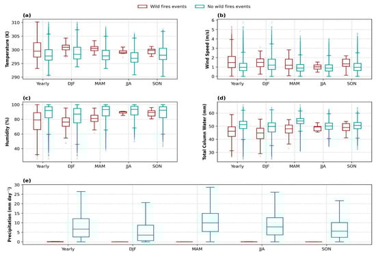 Boxplots of days/events with (dark red) and without wildfires (green) for (a) 2 m air temperature, (b) wind speed, (c) relative humidity, (d) TCWV, and (e) precipitation.