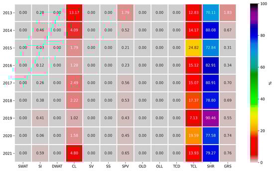 The colors and numbers inside the squares represent the percentage of land cover in Cartagena del Chairá following the classification of [37]. The nomenclature of the x-axis is described in Table S2.