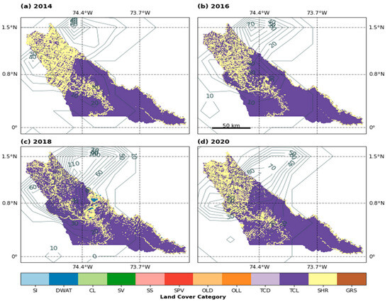 Land cover classification following [37]. A mosaic of images of (a) 2014, (b) 2016, (c) 2018, and (d) 2020. A detailed description of every land cover category can be found in Table S2. The gray contours represent the number of wildfires that develop in the related year. The plot was constructed using the Cartopy Python package [81].