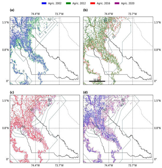 Evolution of the agricultural frontier (color contours) for (a) 2002 and 2012, (b) 2012 and 2016, (c) 2016 and 2020, and (d) 2002 and 2020. No other years are plotted due to data availability. The gray contours represent the number of hotspots produced in (a) 2002, (b) 2012, and (c,d) 2020. The plot was constructed using the Cartopy Python package [81].