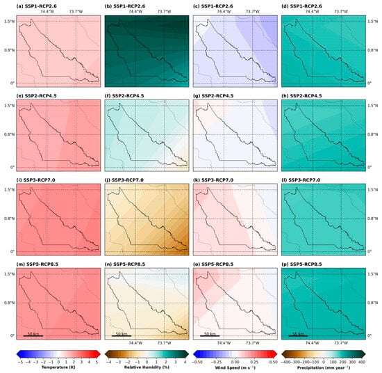 Climatological anomalies between the near-future and the historical period for boreal-winter for (a,e,i,m) the surface air temperature, (b,f,j,n) surface RH, (c,g,k,o) surface wind speed, and (d,h,l,p) precipitation. Additionally, each row represents a different scenario: (a–d) SSP1-RCP2.6, (e–h) SSP2-RCP4.5, (i–l) SSP3-RCP7.0, and (m–p) SSP5-RCP8.5. The plot was constructed using the Cartopy Python package [81].