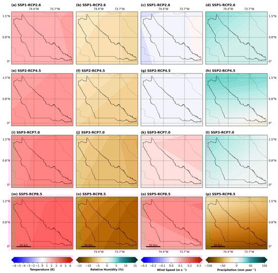 Climatological anomalies between the near-future and the historical period for boreal summer for (a,e,i,m) the surface air temperature, (b,f,j,n) surface RH, (c,g,k,o) surface wind speed, and (d,h,l,p) precipitation. Additionally, each row represents a different scenario: (a–d) SSP1-RCP2.6, (e–h) SSP2-RCP4.5, (i–l) SSP3-RCP7.0, and (m–p) SSP5-RCP8.5. The plot was constructed using the Cartopy Python package [81].
