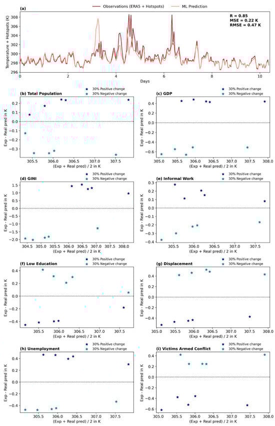 ML models have been used for a large number of applications, some of which have focused on the prediction of meteorological variables [69], air quality [38], and wildfires (e.g., [70]), producing reliable forecasts and showing their potential to be used to understand the importance of several variables [71], and also to create sensitivity experiments that could be used to evaluate strategies or scenarios ([13,41]). Ref. [41] performed sensitivity analyses to understand the tropospheric ozone variations due to the COVID-19 lockdowns, showing the potential of ML to process understanding. Following this research road, Ref. [13] used an ML model to create scenarios of land cover change depending on possible future conditions and evaluate their possible impacts on the Amazon. Here, we use a hybrid of these two approaches to determine which meteorological and socio-economic variables must be measured, evaluated, and, in the case of the socio-economic variables, improved by, for example, enacting policies or creating employment.