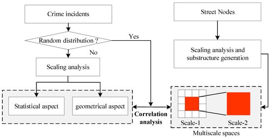 To achieve the research goal of this study, two kinds of geographic data were adopted, i.e., crime incidents and street nodes. The analysis of the heterogeneity of crime distribution is based on crime incidents and the underlying geographic space, which can be generated by the street nodes. Specifically, crime heterogeneity can be analyzed from two aspects. First, the aggregation of crime is checked by random distribution testing (e.g., the spatial statistic described in Section 2.1), although the distribution of crime incidents often violates the random distribution and exhibits a clustering tendency. In addition, the heterogeneity is also described by a scaling analysis method while considering both the statistical and geometrical distribution [,]. The key idea of scaling analysis is to describe the geographic distribution from multiple scales, specifically, by representing the geographic distribution as a hierarchy of recursive clusters or subspaces. To explore the influence of multiscale geographic space on crime, “living structure” and “natural cities” are generated by the street nodes, then geographic space can be represented as a hierarchy of recursive subspaces []. Finally, the correlation between crime distribution and underlying natural cities could be analyzed at multiple scales. The general research strategy of this study is shown in Figure 1.