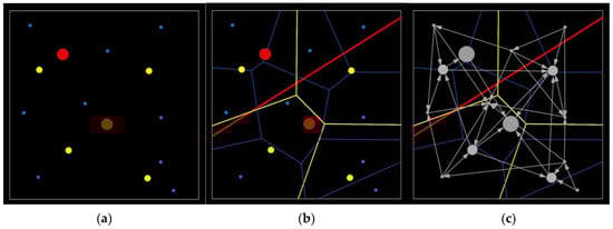 Illustration of the topological representation. (a) 15 points are categorized in three hierarchical levels, indicated by different colors, i.e., red, yellow and blue for first to third levels; (b) points in same hierarchical level are used to partition the space by generating Thiessen polygons; and the boundaries of Thiessen polygon partitions are represented by lines in corresponding color; (c) topological representation, i.e., a complex network is constructed based on polygon–polygon relationships, and links in the network are represented by gray lines with arrows.
