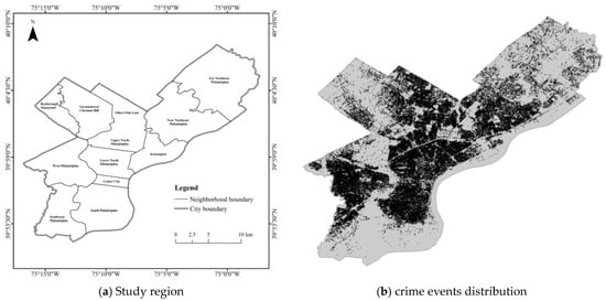 In this study, both the crime and street node data in the city of Philadelphia are collected. Both the crime data and street nodes data can be accessed from the Philadelphia Police Department (https://www.opendataphilly.org/, accessed on 1 June 2022). Located in southeastern Pennsylvania, Philadelphia is an economic and cultural anchor of the greater Delaware Valley, with a population of 1,580,863 (based on 2017 census-estimated results). The crime occurrence in Philadelphia consistently ranks above the national average, which is a major concern for the government of the city of Philadelphia. In this study, we mainly focus on crime occurrences in the years of 2019, considering the dramatic changes (e.g., regarding the social inequality) caused by COVID-19. During this period, there are 25,427 street nodes and 159,313 crime incidents in total, which is mainly composed of violent crimes (e.g., robbery) and property crimes (e.g., theft). The distribution of the study region and crime data are shown in Figure 3. The numbers of crime incidents are so huge that it is difficult to identify specific spatial patterns. However, the distribution of crime and street nodes are highly similar by simple visual comparation.