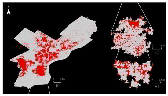 The association analysis between crime and underlying geographic space is analyzed at multiple scales. To do that, the street nodes are further used to generate natural cities at different levels of scale, and then the multiscale natural cities are regarded as the fundamental subspace where crime events occur. The reason behind the operation is that underlying geographic space determines human mobility or human activities, and human mobility is a critical factor for crime occurrence which has been widely verified by environmental criminal theories [,,]. The hierarchical subspace generated by street nodes is shown in Figure 8. By a visual comparison of Figure 5 and Figure 8, it can be found that there is a high similarity between the distribution of crime hotspots and the underlying subspaces. To quantify the correlation, we overlap the crime distribution and the generated hierarchical subspace, which is shown in Figure 9. Then, the clustered spatial co-location rule is applied to measure the spatial correlation. In this study, we mainly concern the influence of underlying geographic space on crime distribution; therefore, only two kinds of factors are considered, i.e., the underlying subspace and crime hotspots. Specifically, the clustered spatial co-location rule is simply expressed as “underlying space → crime distribution”, while treating the subspace as antecedent and crime distribution as consequent. The related indexes in the rules are in Table 2.