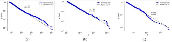 Scaling analysis on statistical distribution for multiscale crime hotspots: (a) crime_level1; (b) crime_level2; and (c) crime_level3.