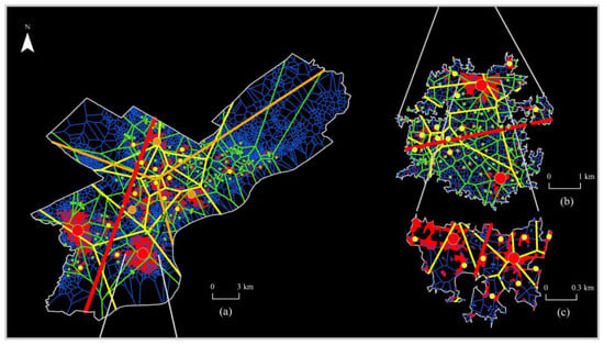 In this study, we borrowed the recently proposed concepts of “living structure”, “natural cities” and “topological representation” in geographic information science [,,]. In the domain of geographic information science, spatial data are often represented by a raster or vector data format, and geographic space is abstracted as either a large set of pixels or a variety of points, lines and polygons. Recently, some research argued that geographic space is just a collection of numerous lifeless pieces (e.g., pixels, points and lines) under conventional geographic representations, which pose little meaning in space cognition. In real geographic space, entities are connected to other things, to constitute even larger things, forming a hierarchy of recursive entities or subspaces (e.g., the street, neighborhood and city). Under such a worldview, the world is an unbroken whole that possesses a physical structure, called a “living structure”. The living structure can be represented as a hierarchy of recursive subspaces, which is a truly multiscale representation for geographic space. The concepts of natural cities refer to spatial patches adaptively portrayed by the density of spatial features (e.g., the street nodes, points of interest, etc.) and head/tail breaks [], which are different from conventional concepts of cities defined by census authorities. The detailed process of generating natural cities can be found in Jiang’s research []. The living structure is closely related to natural cities, referring to the fact that the spatial centers of natural cities support each other and form an organic whole. Topological representation is the method used to describe the living structure, which aims to build up a supporting relationship for hierarchical natural cities using a complex network. The detailed description for living structure generation and topological representation can be found in related studies [,,].