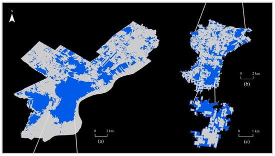 Spatial distribution of natural city for crime distribution. (a) Level Ⅰ: Philadelphia and its natural cities (the largest natural city is termed Level Ⅱ), (b) natural cities at Level Ⅱ (the largest one is termed Level Ⅲ), and (c) natural cities at Level Ⅲ.