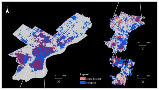 Overlay analysis of distribution of crime hotspot and underlying subspaces. (a) the overlay of crime hotspots and subspaces at level 1; (b) the overlay of crime hotspots and subspaces at level 2; (c) the overlay of crime hotspots and subspaces at level 3.