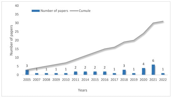 This axis tracks the number of publications per year that have used GIS-based-MCE methods to identify suitable sites for aquaculture (Figure 2). It is observed that the number of published papers is not stable and fluctuates over the selected time period (from 2000 to 2022). Furthermore, there were no articles published before 2005 meeting the criteria defined by authors previously. However, three articles were published in 2005, which may indicate renewed interest in the use of GIS–MCE methods in the aquaculture field.